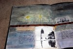 Art:  brush stroke, “washing’ water color, using rubber cement glue, aging paper, page thematics, placement of  elements for artistic pleasure, using a light box