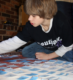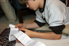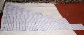 When the 9 year old is ready, one of the last things he does in lower elementary is begin to lay out the decanomial. One red bead, next to it two red beads, next to that three red beads, etc. all the way across to ten. Then the next row 1 green (2) bar, next to it 2 green bars, and so on continuing across to 10 and down to 10. The tedium and need for perfectly aligned rows stressing the nine year old. Then come the first years. The little guys gather round ever so carefully not to upset the rows and rows of perfectly aligned beads. The six year old watches with rapt attention or asks to hand the builder his needed beads. The second years watch from a distance in their aloof state.
