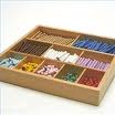 From a small age, the Montessori child touches the beads and sees one is one thing and that three groups of three is a total of nine things. He can physically see that 1 x 2 has the same product as 2 x 1.