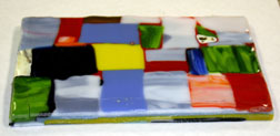 AV is beginning another of these pattern bar bowls. He is doing a more abstract pattern using scrap glass. He built a dam, lined it with special kiln paper, and stacked interesting patterns of glass in the dam until he reached a pre-agreed to height. Mike then fused it. This is the first fusing’s result.