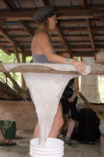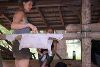 After one has prepared the mixture, it is time to prepare the hide to soak in the brains. Laying them out, wrapping them precisely, then putting all you weight behind the wringing out.