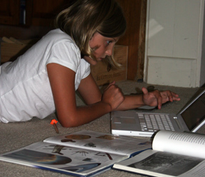 She is working on researching topics, finding facts, sorting and ordering them by importance, and then typing them into a coherent paragraph.
