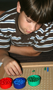 JV has done quite a bit of square root over last year. This year he picked up the peg board and promptly proved he couldn’t remember how to work it out even with the materials. A quick reminder was helpful. Another day or two of just working it out on the board bought us to a brief reminder of the written mathematical approach. He checked his previous work using the written approach and the board. It is all coming back. Hurray.