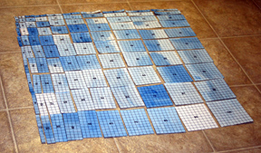 This layout can take days of precision. It requires using a ruler to keep the lines straight. It is important to point out that, as we go, the diagonal is comprised of the squares of 1 through 10. We discuss this and decide that we could replace these squares with the actual squares from the bead cabinet.