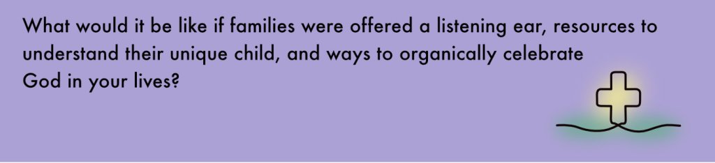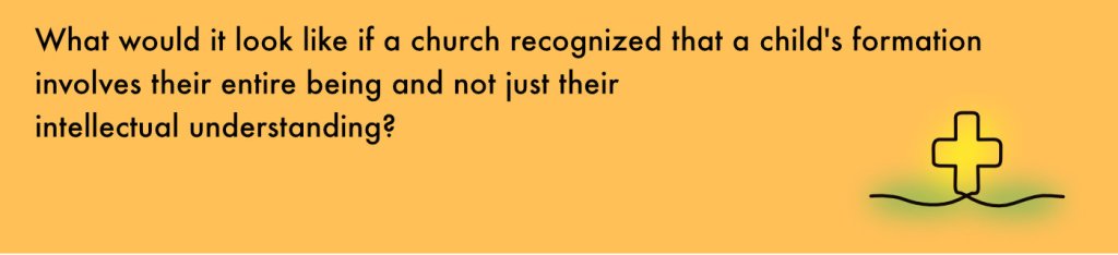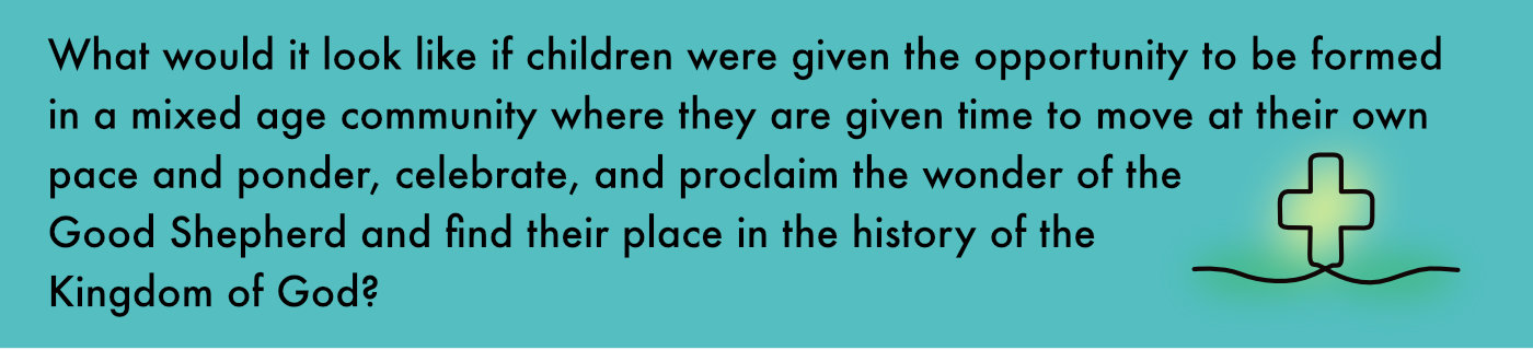 Children learn about the life of Jesus, what they will see in community worship, and Jesus’ parables. Encircling this is the community who all pray, laugh, and work together.