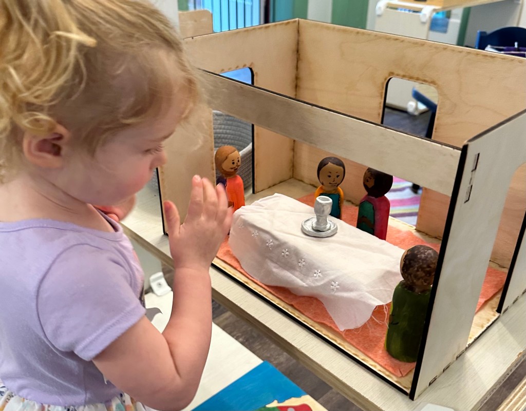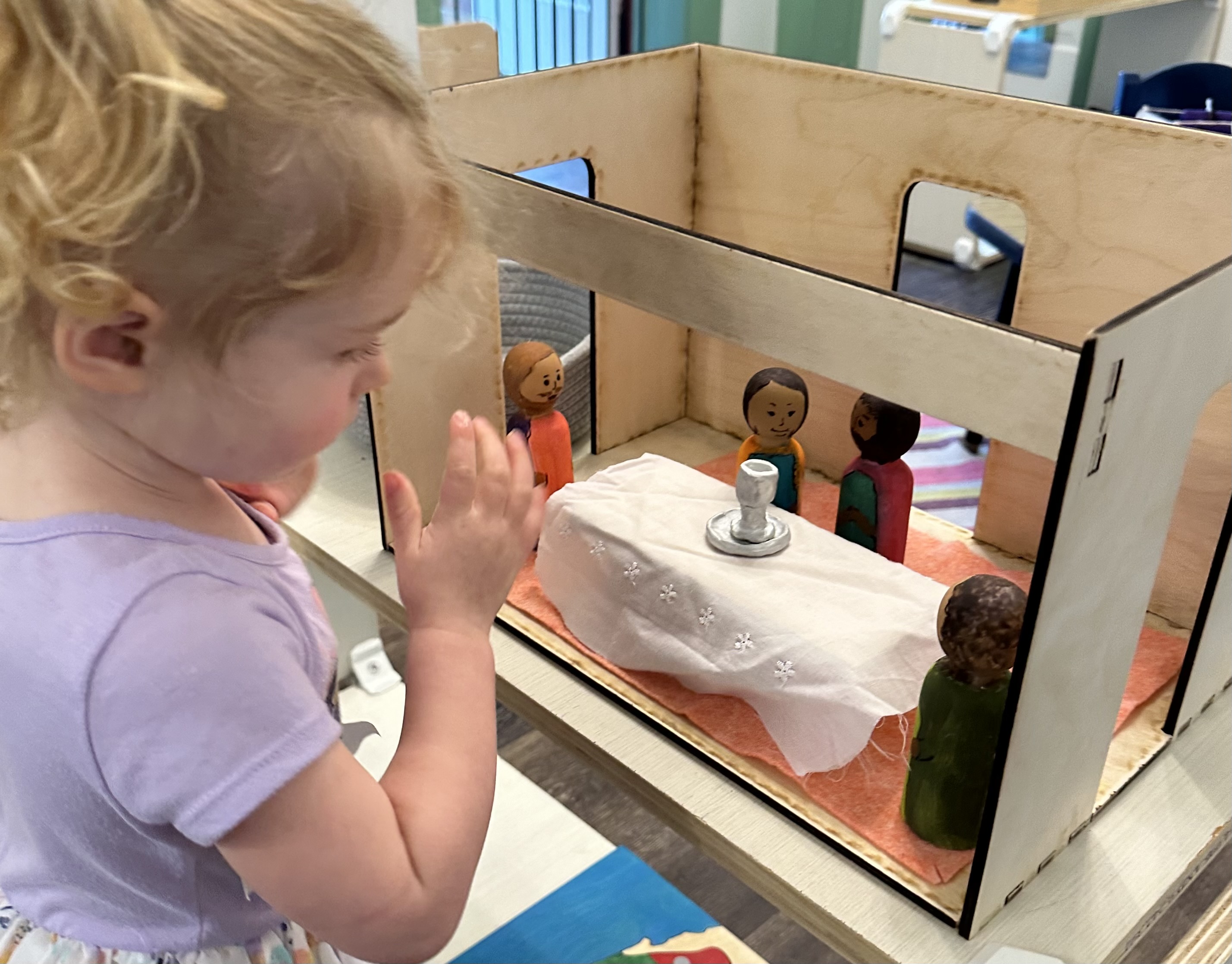 This toddler is beginning the exploration of Jesus’ special meal with his friends. She listened to the scripture reading and moved Peter and John to set up for the meal. She brought Jesus and the other disciples to the room, Jesus offered his friends the Last Supper. After we sing a song together, she leads the group to take a nap while Jesus prays.