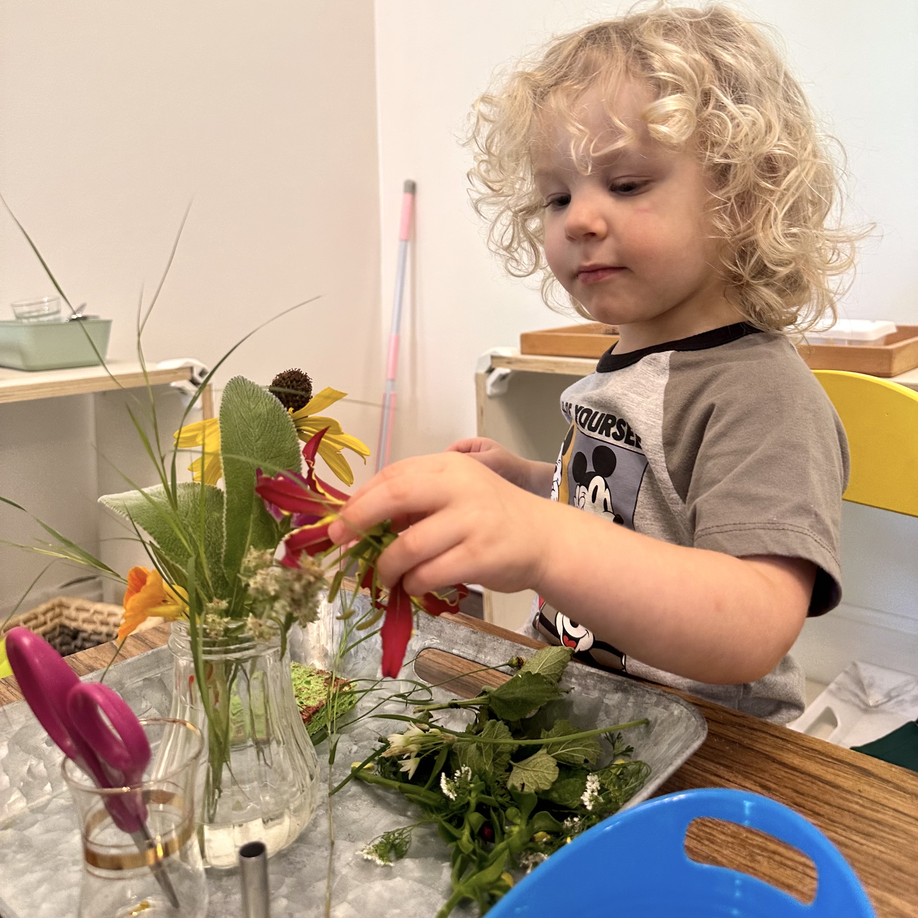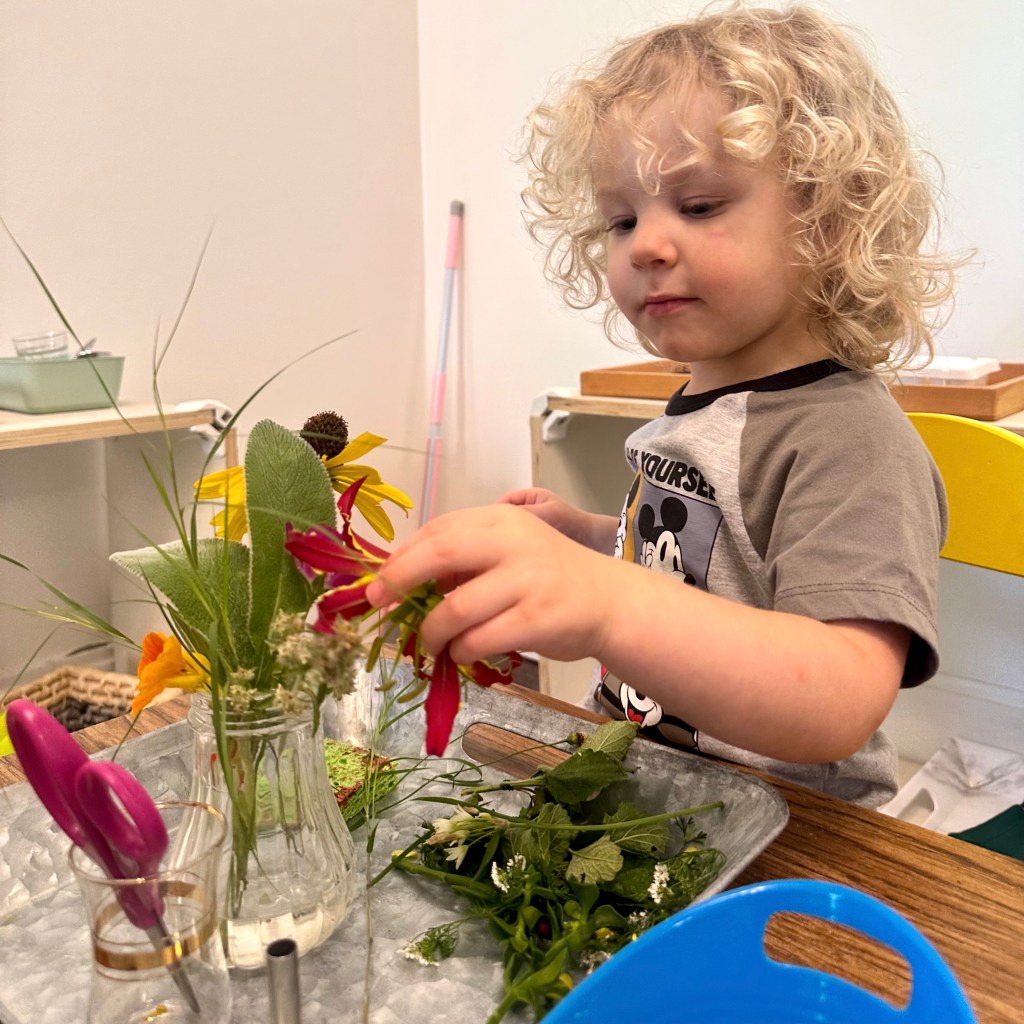We provide the same Montessori materials that you might see in a traditional Montessori toddler environment – ones to assist the child’s language explosion, desire to acquire practical skills, and take care of themselves.