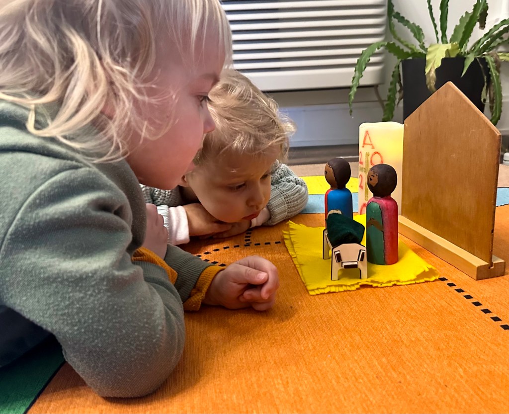 We add developmentally appropriate lessons like Psalm 23 the Annunciation to Mary, the colors of the church year, and a weekly celebration at the prayer table. We assist the child to spiritually grow in the world their bodies are yearning to explore.